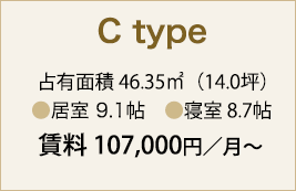 占有面積 46.35u(14.0坪)●居室 9.1帖 ●寝室 8.7帖